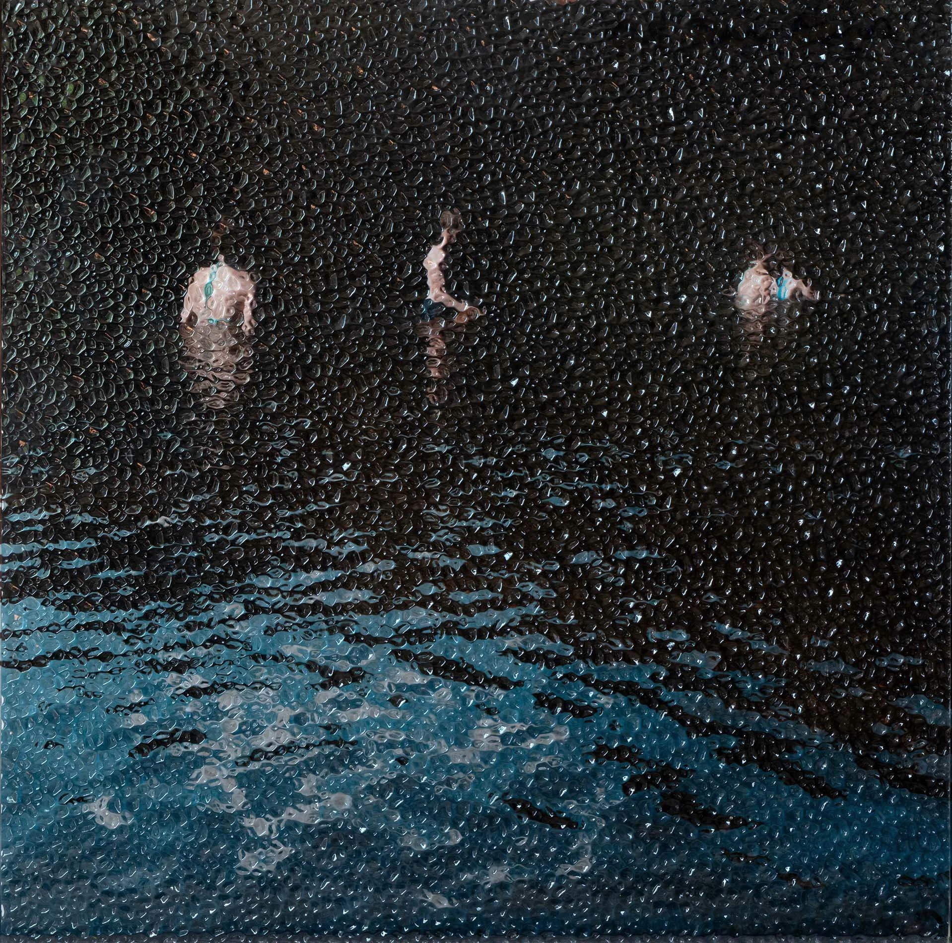 Chaque scène – fragment de corps, instant de baignade – se lit à travers ce prisme changeant, où les reflets deviennent un langage plastique, une composante essentielle de l’œuvre. Le verre, inspiré des techniques du vitrail, propose une palette de textures et de nuances qui diffractent la lumière, la font vibrer selon l’angle de vue, déconstruisant l’image photographique pour révéler une nouvelle dimension visuelle et sensorielle, où les corps semblent se dissoudre et se recomposer.